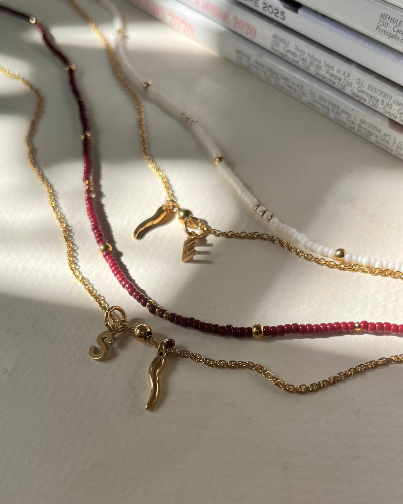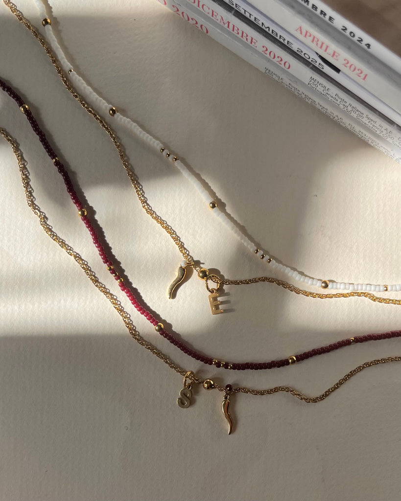 Girocolli Mini mini doppi, micro perline giapponesi e piccoli elementi dorati, leggeri e luminosi. Due collane insieme con un'unica chiusura. Nella catenina un cornetto portafortuna e una piccola iniziale.