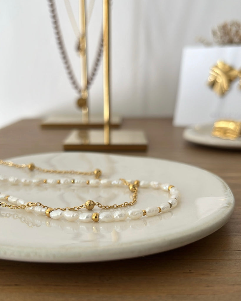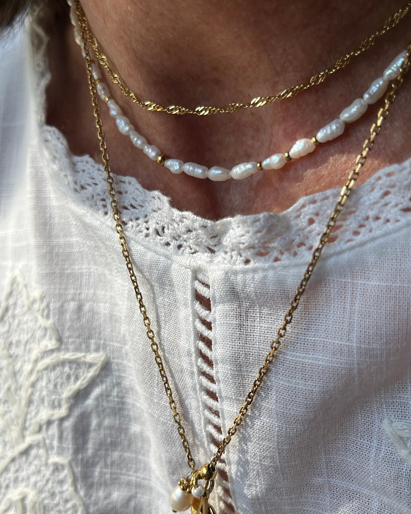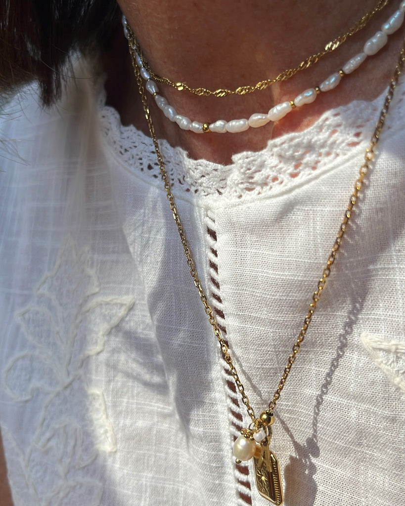Un girocollo di perle dallo stile semplice e delicato con piccoli dettagli dorati ad illuminare. Un girocollo di perle dallo stile fresco e contemporaneo