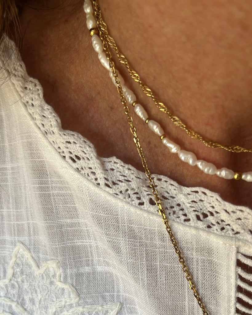 Lunghezza regolabile 37cm+5 , perle naturali irregolari 3-5mm, tutto Nickel free. Elementi dorati in acciaio  oro che mantengono il colore
